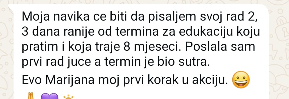 Spojila sam psihologiju, pedagogiju i iskustvo iz digitalnog marketinga kako bih ženama pomogla da prestanu odgađati i žive u skladu sa sobom. Do sada sam podržala 30+ žena da izgrade nove navike i vrate vjeru u sebe.